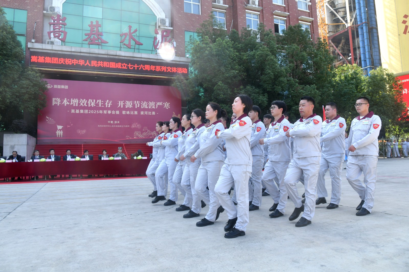 9月30日上午,嵩基集團在嵩基水泥迎賓廣場隆重舉辦以“降本增效保生存 開源節(jié)流渡嚴寒” 為主題的慶祝中華人民共和國成立76周年軍事會操、歌詠比賽及拔河比賽系列文體活動。此次活動旨在喜迎新中國76周年華誕,凝聚奮進力量,展現(xiàn)企業(yè)風貌。集團公司董事長屈松記、總經(jīng)理李天義等領導出席活動,各單位代表隊及觀摩人員510余人參加。